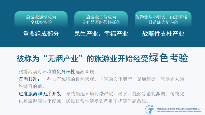 20世纪中叶起,全球经济逐渐复苏并快速增长,工业化和城市化逐步加快,交通、通讯、支付等基础设施和旅游设施的改进,大众消费文化的兴起,为旅游提供了更多便利,旅游业全球化加速发展,并逐渐成为全球经济的重要组成部分。改革开放特别是党的十八大以来,我国旅游发展步入快车道,旅游业从小到大、由弱渐强,日益成为新兴的战略性支柱产业和具有显著时代特征的民生产业、幸福产业。旅游业通常被认为是“无烟工业”“无形贸易”。然而,由于旅游产业价值链条构成的碎片化,过度旅游和无序开发留下深深的环境足迹,比如环境污染严重,能源消耗激增,传统文化被旅游商业化侵蚀,居民日常生活受到干扰等问题。
