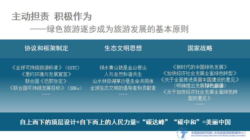 我们更加关注环境,主动担责,积极作为。《全球可持续旅游标准》《里约环境与发展宣言》、联合国《巴黎协定》《联合国可持续发展目标》等国际标准和公约相继出台,习近平生态文明思想、绿色发展理念的重要论断,为新时代中国绿色旅游发展提供了理论遵循和思想指引。