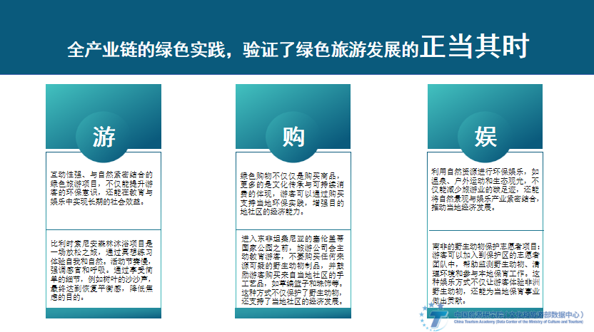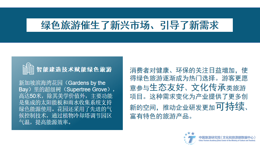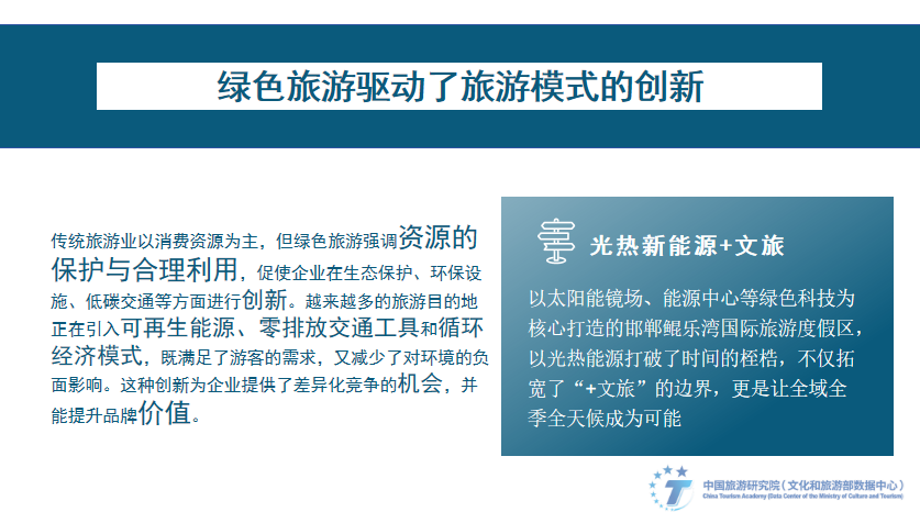 总结以上绿色旅游的产业实践,我们发现:绿色旅游驱动了旅游模式的创新。传统旅游业以消费资源为主,但绿色旅游强调资源的?;び牒侠砝?,促使企业在生态?;ぁ⒒繁I枋?、低碳交通等方面进行创新。越来越多的旅游目的地正在引入可再生能源、零排放交通工具和循环经济模式,既满足了游客的需求,又减少了对环境的负面影响。这种创新为企业提供了差异化竞争的机会,并能提升品牌价值。以太阳能镜场、能源中心等绿色科技为核心打造的邯郸鲲乐湾国际旅游度假区,以光热能源打破了时间的桎梏,不仅拓宽了“+文旅”的边界,更是让全域全季全天候成为可能。