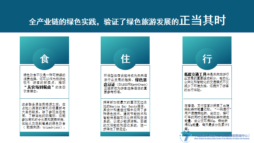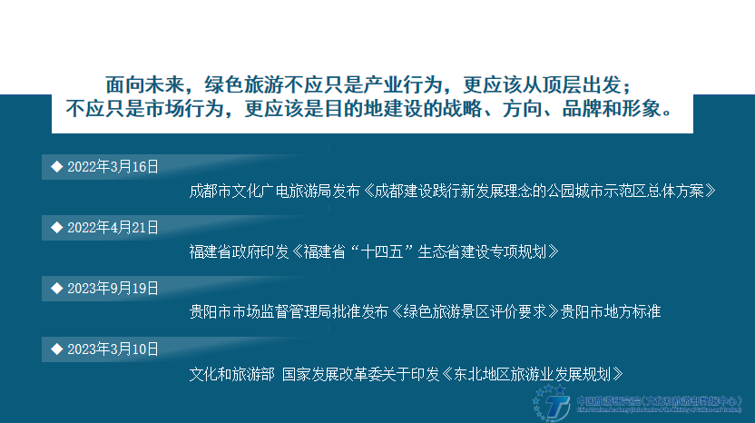 面向未来,绿色旅游不应只是产业行为,更应该从顶层出发;不应只是市场行为,更应该是目的地建设的战略、方向、品牌和形象。《成都建设践行新发展理念的公园城市示范区总体方案》《绿色旅游景区评价要求》贵阳市地方标准、《东北地区旅游业发展规划》相继推出,都是以绿色旅游发展理念为引领,探索旅游业发展新模式,实践生态?;?、绿色发展和旅游发展相统一的举措。