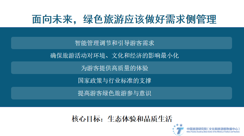 发展绿色旅游的核心目标是生态体验和品质生活。面向未来,绿色旅游首先应该做好需求侧管理。目的地也在围绕智能管理调节、降低对环境、文化和经济的影响、提供高质量体验、出台政策与标准、增强公众绿色环保意识等方面积极实践。比如:随季节不同,全国多个旅游目的地执行淡旺季票价,如山西省诸多景区、贵州诸多景区、扬州部分景区、更有故宫、布达拉宫、青海湖、黄山、莫高窟、九寨沟等多家知名5A级景区均位列其中。比如广东从2010年4月起,省星级饭店已实行不再一次性日用品配送至每间客房,仅在客人有需要时配送。倡导游客入住尽可能自己携带相关日用品,促进资源的减量化和再利用。浙江西塘率先在省内制定《低碳旅游细胞标准》,结合旅游产业特色,打造民宿餐饮低碳品牌,引导民宿、餐饮形成绿色经营方式、提供绿色服务产品、营造绿色消费环境。
