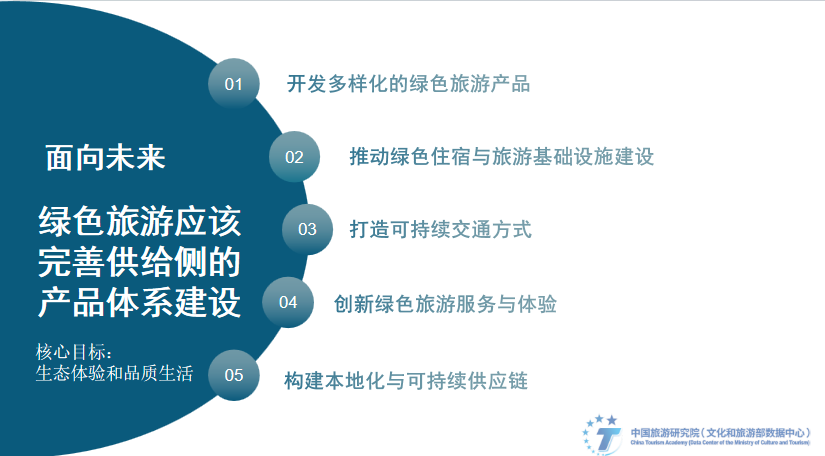 面向未来,绿色旅游应该完善供给侧的产品体系建设。都江堰市以山水为底色、以生态为特色、以文化为灵魂、以康养为载体、以旅游为纽带,立足区域内生态、道文化、中医药等资源,推动旅游业与大健康产业深度融合发展,吸引追求身心健康的游客前来体验。大连正着力推动文旅业向绿色低碳的优质产业转型,大连始终致力于打造森林城市,截至2022年,大连全市森林覆盖率达到41.5%,大连先后开展了城乡绿道工程、生态森林公园建设,不断丰富农业观光、森林旅游、乡村旅游等业态。面向未来,绿色旅游还要具有可持续发展的能力和完备的保障体系。