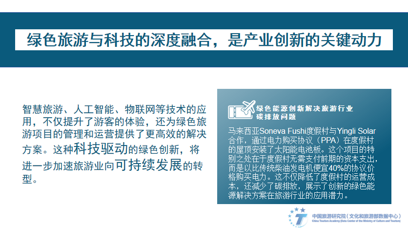 绿色旅游与科技的深度融合,是产业创新的关键动力。智慧旅游、人工智能、物联网等技术的应用,不仅提升了游客的体验,还为绿色旅游项目的管理和运营提供了更高效的解决方案。这种科技驱动的绿色创新,将进一步加速旅游业向可持续发展的转型。马来西亚Soneva Fushi度假村与Yingli Solar合作,通过电力购买协议(PPA)在度假村的屋顶安装了太阳能电池板。这个项目的特别之处在于度假村无需支付前期的资本支出,而是以比传统柴油发电机便宜40%的协议价格购买电力。这不仅降低了度假村的运营成本,还减少了碳排放,展示了创新的绿色能源解决方案在旅游行业的应用潜力。