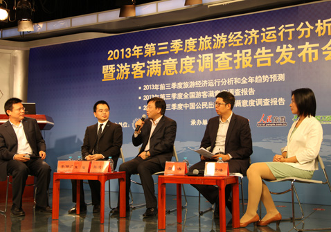 2013年10月14日由中国旅游研究院主办,人民网旅游频道、旅游卫视协办的2013年第三季度旅游经济运行分析暨游客满意度调查报告发布会在人民网演播室举行。中国旅游研究院院长戴斌教授、北京联合大学旅游学院副院长张凌云教授,中旅总社客户管理部总经理周涛、中国旅游研究院产业所所长李仲广副研究员等出席了发布会。来自人民日报、新华社、中央电视台、中央人民广播电台、中国国际广播电台、中国旅游报、经济日报、中国新闻社、央视网、中国网、搜狐网、凤凰网等媒体机构代表也参加了发布会。