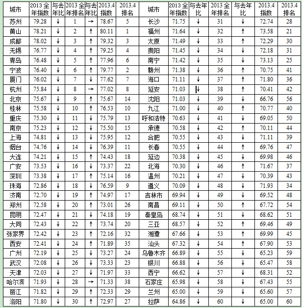 空气质量等城市环境敏感因素的满意度下滑。全年游客对样本城市的整体环境满意度为74.11,处于"一般"水平,比2012年提高0.35。全年调查显示,相比城市形象宣传和知名度,游客对城市建设和城市管理的满意度相对较低。第四季度游客对样本城市的城市建设和城市管理等方面的满意度环比有一定程度下降,对民俗特色的满意度下降幅度最大,仅处于"及格"水平。全年处于"基本满意"水平的指标依次是:知名度、开放度、现代化程度、美丽程度,处于"一般满意"水平的指标依次是:应急救援系统、信息化程度、市民形象和行为、园林绿化、市容市貌、卫生设施、安全感、自然生态、城市规划、旧城和历史建筑?;?、文化氛围、无障碍设施、施工管理、民俗特色、便利感、空气质量。
