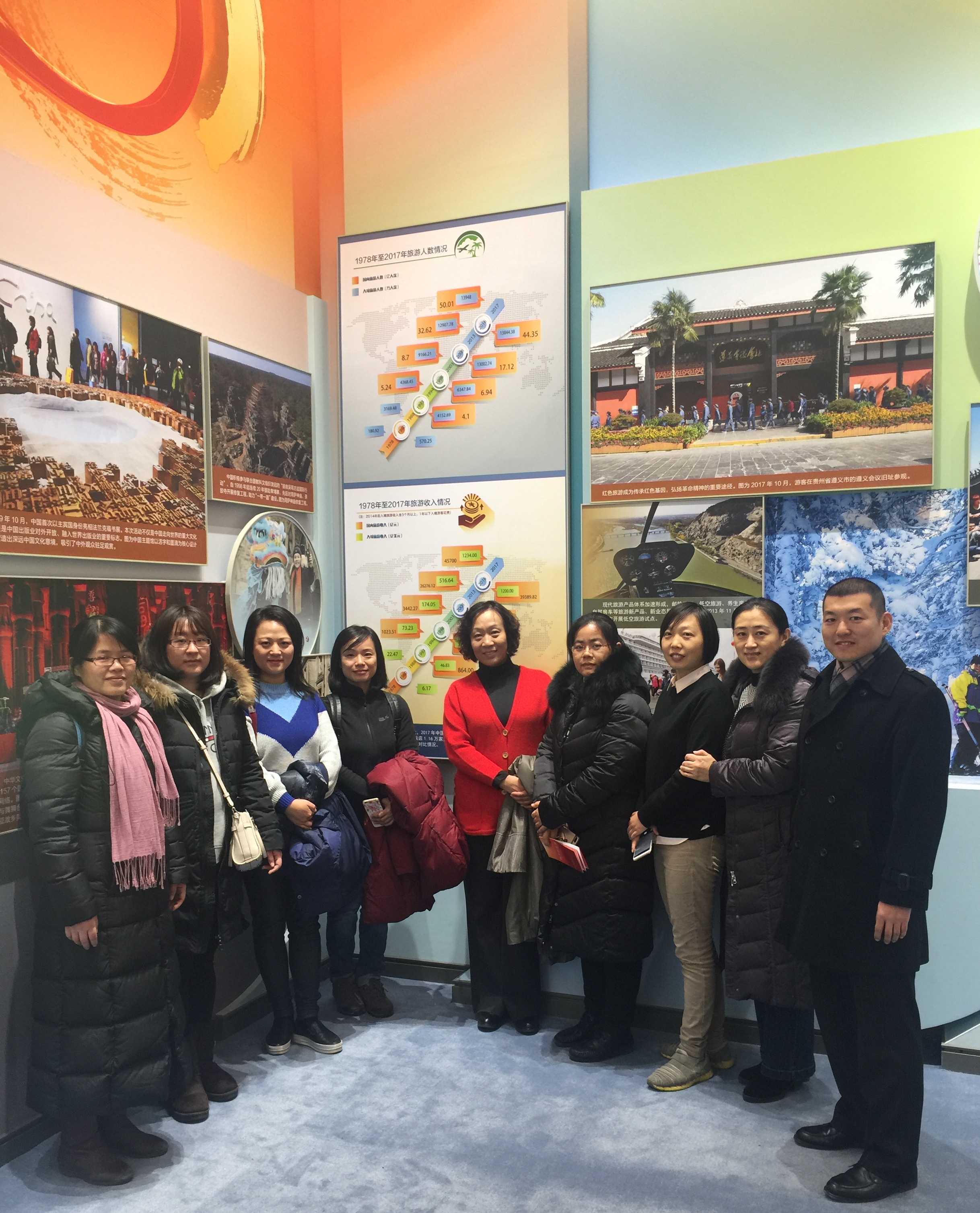 部分人员在我院提供的改革开放40年旅游收入资料的展板前合影留念