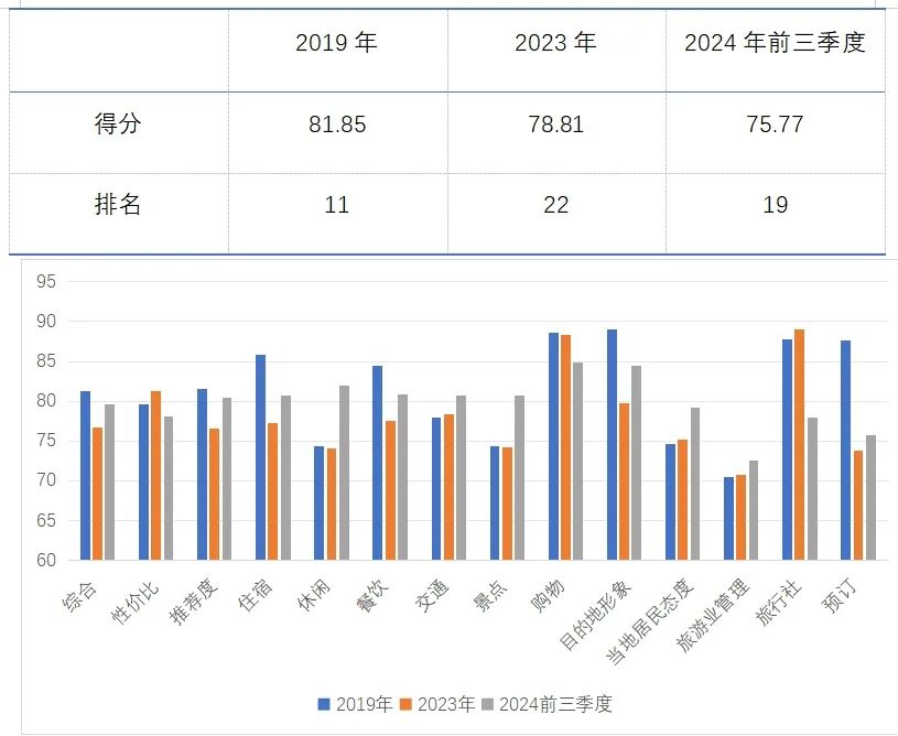 2024年前三季度,中国游客赴意大利出游满意度75.77分,位列全球第19位。相比2019和2023年意大利出境游客满意度得分从“满意”区间(80-85分)下滑至“基本满意”区间(75-80分)。